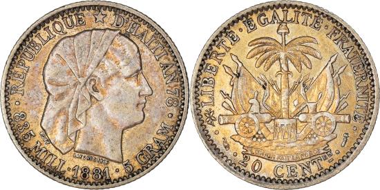 | | Coin, Haiti, 20 Centimes, 1881, Paris, , Silver, KM:45 | | | Tiara head right, National arms | | FEATURES |