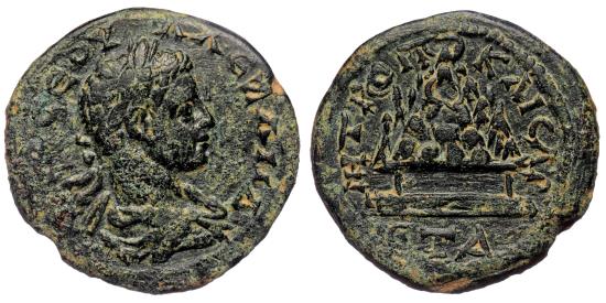 Obverse: AY K CЄOYH AΛЄΞANΔ. Laureate and draped bust of Severus Alexander right. Reverse: MHTPOΠO KAICA. Agalma of Mount Argeaus on low, garlanded altar or plinth; ΕT Δ below. Very nice coin, in VF+/EF- condition, conserving complete details un both sides, bold reliefs and a precious green patina totally natural. BMC 326. Caesarea of Cappadocia mint, year 4 = AD 225/6. 12,5 g - 26 mm -------------------------------------------------------------------------------------------------- Visit our site about Numismatics and Archaeology: aeternitas-numismatics.com |