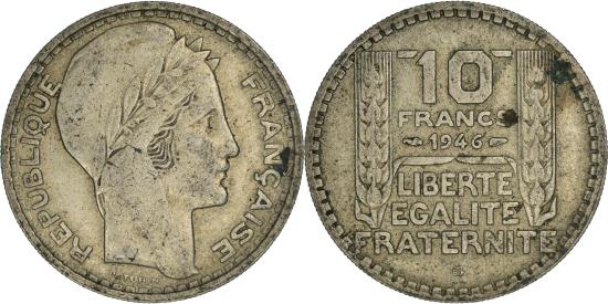 | | Coin, France, Turin, 10 Francs, 1946, Beaumont - Le Roger, Rameaux longs | | | Turin, Laureate head right, Denomination above date, inscription below, grain columns flank, Large head | | FEATURES |