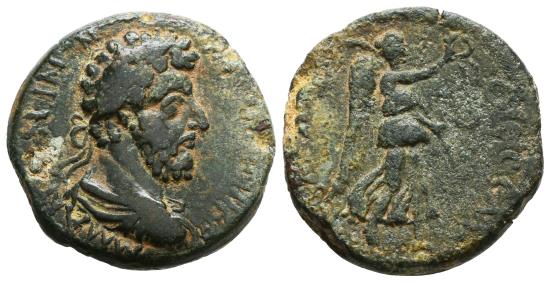 COMMODUS. Ae 24. AD 177-192. Macedonia, Thessalonica. Obv/ Laureate and draped bust right. Rev/ Nike advancing right, holding wreath and palm; crescent to right. Cat: Touratsoglou Em. I, Group B; SNG ANS 853; Varbanov 4317. Bronze (Ae) 10,9g - 24mm. Rare. |