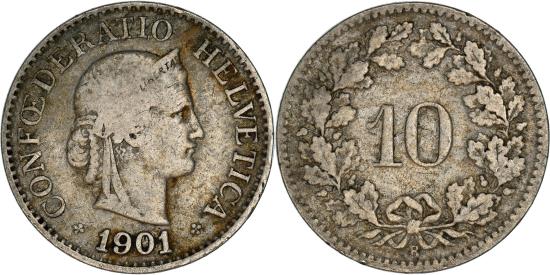 | | Coin, Switzerland, 10 Rappen, 1901, Bern, , Copper-nickel, KM:27 | | | Crowned head right, Value within wreath, CONFOEDERATIO HELVETICA Karl Schwenzer | | FEATURES |