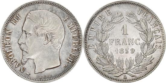 | | Coin, France, Napoleon III, Napoléon III, Franc, 1859, Paris, | | | Napoléon III, Head left, Denomination within wreath, NAPOLEON III EMPEREUR | | FEATURES |