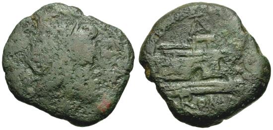 TA ligate above prow right, S to right, ROMA in exergue