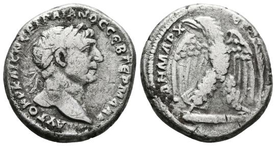 TRAJAN. AR Tetradrachm of Antioch, Seleucis and Pieria. Dated RY 15 = AD 110/1. Obv/ •ΑΥΤΟΚΡ ΚΑΙC ΝЄΡ ΤΡΑΙΑΝΟC CЄΒ ΓЄΡΜ ΔΑΚ•, laureate head to right. Rev/ •ΔΗΜΑΡΧ•Є(Ξ•ΙЄ•ΥΠΑΤ•Є•), eagle, with head and tail to left and wings spread, standing facing on club. Cat: McAlee 439 (Tyre); Prieur 1504 (Tyre); RPC III 3538. Silver (Ar) 13,2g - 26mm. |