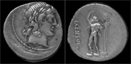 rev: the satyr Marsyas, standing left with wineskin on his shoulder, behind him column