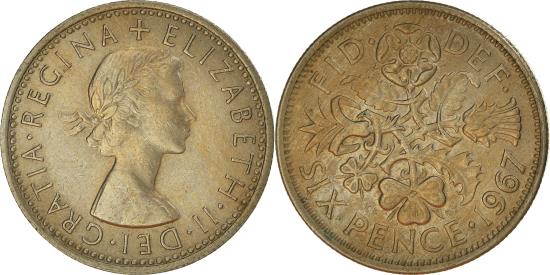 | | Coin, Great Britain, Elizabeth II, 6 Pence, 1967, , Copper-nickel | | | Laureate bust right, Flora; leek, rose, thistle and shamrock, Without BRITT OMN Mary Gillick | | FEATURES |