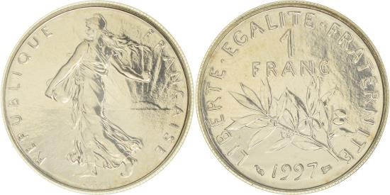 | | Coin, France, Semeuse, Franc, 1997, Paris, , Nickel, KM:925.1 | | | Semeuse, The Seed Sower, Laurel branch divides denomination and date, Without mint mark., Louis Oscar Roty | | FEATURES |
