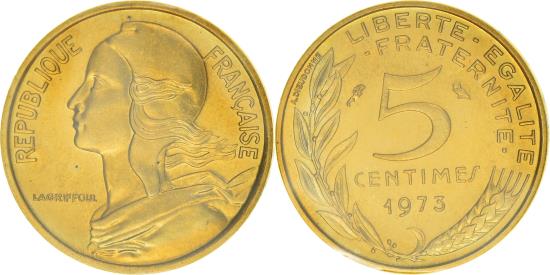 | | Coin, France, Marianne, 5 Centimes, 1973, Paris, FDC, | | | Marianne, Liberty bust left, Denomination above date, grain sprig below, laurel branch at left, 1991-1993 dated coins, non-Proof exist in both coin and medal alignment., Henri Lagriffoul | | FEATURES |