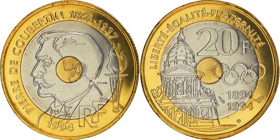 | Coin, France, Pierre de Coubertin, 20 Francs, 1994, Paris, ESSAI, |