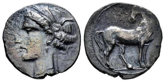 NORTH AFRICA. Carthage. Ar, Shekel. 300 BC. Obv/ Head of Tanit left, wearing wreath and single-pendant earring. Rev/ Horse standing right, head left. Cat: Sng Cop-143; MAA-37; Acip-576. Silver (Ar) 4,67g - 19mm. Slight porosities on the obverse. Delicate patina. Rare. |