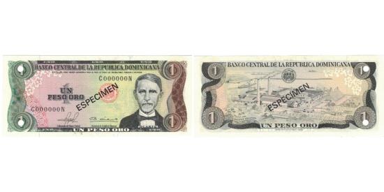 Banknote, Dominican Republic, 1 Peso Oro, 1981, 1981, Specimen, KM:117s2Banknote, Dominican Republic, 1 Peso Oro, 1981, 1981, Specimen, KM:117s2