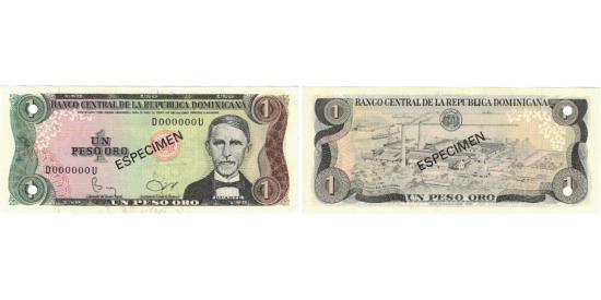 | | Banknote, Dominican Republic, 1 Peso Oro, 1982, 1982, Specimen, KM:117s3 | | | Specimen with black overprint: ESPECIMEN. on both sides. 1982. Punch hole cancelled., J. P. Duarte at right, orange bank seal at left., Sugar refinery, dates (lightly printed) in upper margin., Black, dark green and dark brown on multicolor underprint. | | FEATURES |