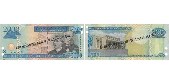 | | Banknote, Dominican Republic, 2000 Pesos Oro, 2003, 2003, KM:174s2, UNC(64) | | | 2003. Specimen. Overprint in black: ESPECIMEN / MUESTRA SIN VALOR once on each side. Punch hole cancelled., Emillo Prud-Homme and José Reyes at right. Wide border printing at upper center right., Teatro Nacional., Black and blue on multicolor underprint. | | FEATURES |