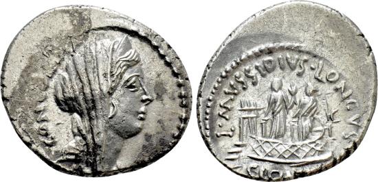 Obv: CONCORDIA. Diademed and veiled head of Concordia right. Rev: L MVSSIDIVS LONGVS / CLOACIN. Two statues of Venus Cloacina on platform with balustrade of the shrine of Venus Cloacina.