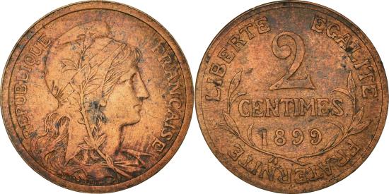 | | Coin, France, Dupuis, 2 Centimes, 1899, Paris, , Bronze, KM:841 | | | Dupuis, Liberty head right, Denomination and date within wreath, Without mint mark or privy mark. | | FEATURES |