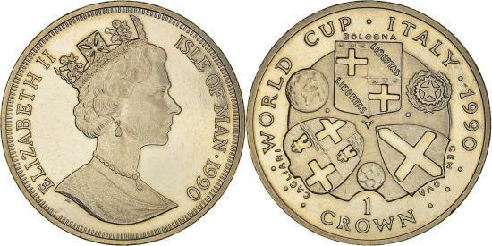 | | Coin, Isle of Man, Elizabeth II, Crown, 1990, Pobjoy Mint, World Cup - | | | Crowned bust right, Three shields flanked by emblems with soccer ball below, Raphael Maklouf | | FEATURES |