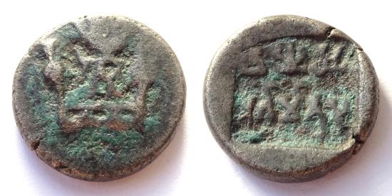 Ahichchatra kingdom of Pancala Agnimitra, ruled c. 80-100 AD AE half karshapana (1.67 g) Obverse: Human figure with flaming hair, standing on ritual platform and flanked by standards Reverse: Brahmi legend Agimitasa with three Panchala dynastic symbols above