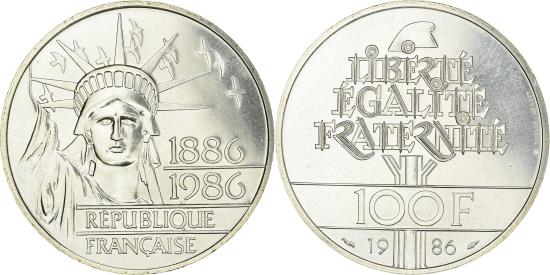 | | Coin, France, Statue de la Liberté, 100 Francs, 1986, FDC, , Silver | | | Statue de la Liberté, Top of statue facing, dates at right, Liberty cap over inscription above denomination, date below | | FEATURES |