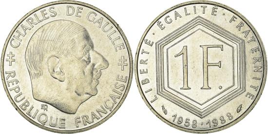 | | Coin, France, Charles de Gaulle, Franc, 1988, Paris, , Nickel, KM:963 | | | Charles de Gaulle, Head right, Denomination within six sided wreath, dates below | | FEATURES |