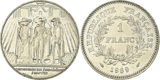 | | Coin, France, États généraux, Franc, 1989, , Nickel, KM:967 | | | États généraux, Denomination within wreath, date below, Three figure monument | | FEATURES |
