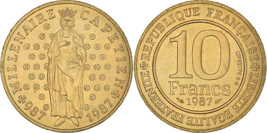 | | Coin, France, 10 Francs, 1987, , Nickel-Bronze, KM:961d | | | Denomination and date within circle, Crowned figure standing at center, rosettes in background | | FEATURES |