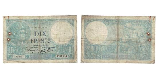 | | France, 10 Francs, Minerve, 1940, 1940-12-12, VF(20-25), Fayette:07.24, KM:84 | | | Minerva at upper left. Signature title: LE CAISSIER GÉNÉRAL., Sitting farm woman., Blue. | | FEATURES |