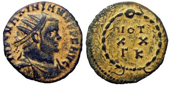 MAXIMIAN HERCULES. Ae21. (2.80.gm/ 21mm). 303 AD Carthage. (ICR 37b). Anv: Draped and radiated bust of Maximiano Hercules to the right, around legend: IMP C MAXIMIANVS PF AVG. Rev: Legend in three lines: VOT / XX / FK within laurea. Good Very Fine.