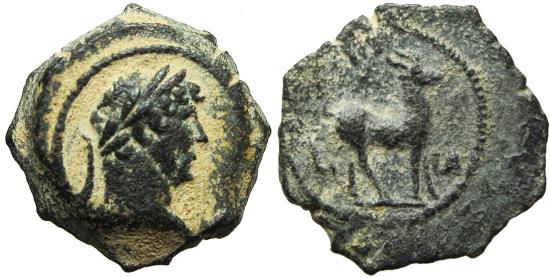 Hadrian Alexandria . 117-138.AD. Æ Dichalkon (14mm, 2.35 g, 12h). Nome issue – Memphites. Dated RY 11 (AD 126/7). Laureate bust right, slight drapery on left shoulder / Antelope standing right; KAPOT above, L IA (date) across field. Emmett 1279. gVF, dark brown patina. Attractive and choice.