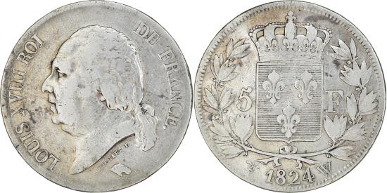 | | Coin, France, Louis XVIII, 5 Francs, 1824, Lille, , Silver, KM:711.13 | | | Louis XVIII, Head left, Crowned arms divide denomination within wreath, LOUIS XVIII ROI DE FRANCE. | | FEATURES |