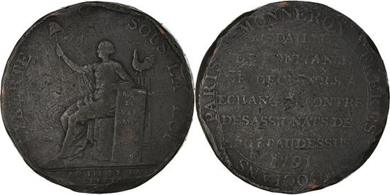 | | Coin, France, 2 Sols, 1791, , Bronze, KM:Tn23, Brandon:217 | | | Figure seated left, Six line inscription and date within inner circle, LIBERTE SOUS LA LOI | | FEATURES |