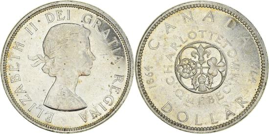 | | Coin, Canada, Elizabeth II, Dollar, 1964, Royal Canadian Mint, Ottawa | | | Laureate bust right, Design at center, dates at outer edges, denomination below | | FEATURES |