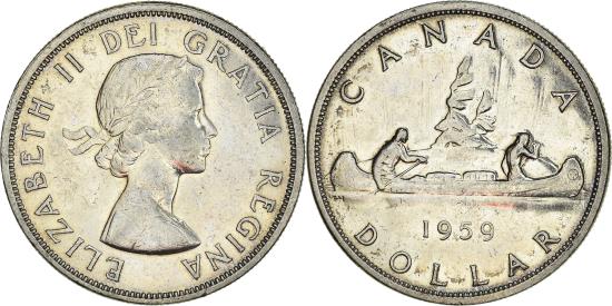 | | Coin, Canada, Elizabeth II, Dollar, 1959, Royal Canadian Mint, Ottawa | | | Laureate bust right, Voyageur, date and denomination below, All genuine circulation strike 1955 Arnprior dollars have a die break running along the top of TI in the word GRATIA on the obverse., Mary Gillick | | FEATURES |