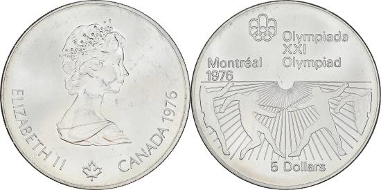 | | Coin, Canada, Elizabeth II, 5 Dollars, 1976, Royal Canadian Mint, Ottawa | | | Young bust right, small maple leaf below, date at right, Fencing, denomination below, Series VI. | | FEATURES |