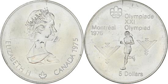 | | Coin, Canada, Elizabeth II, Marathon, 5 Dollars, 1975, , Silver, KM:98 | | | Young bust right, small maple leaf below, date at right, Marathon, denomination below, Series IV. | | FEATURES |