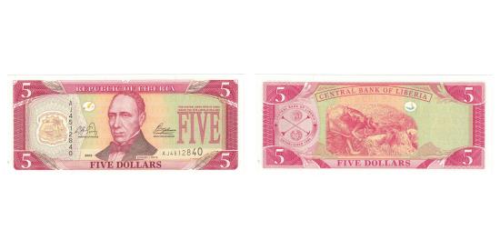 | | Banknote, Liberia, 5 Dollars, 2003, KM:26c, UNC(65-70) | | | 2006., 2 signature varieties., CENTRAL BANK OF LIBERIA at top., Red and brown on yellow underprint. | | FEATURES |