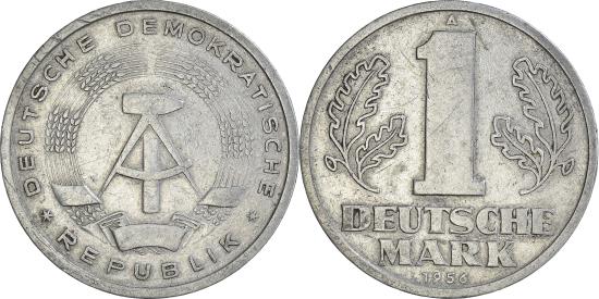 | | Coin, GERMAN-DEMOCRATIC REPUBLIC, Mark, 1956, Berlin, , Aluminum, KM:13 | | | State emblem, Large, thick denomination flanked by leaves, date below | | FEATURES |