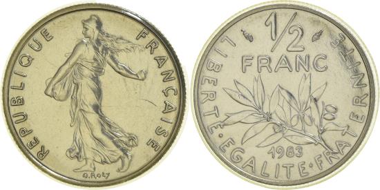 | | Coin, France, Semeuse, 1/2 Franc, 1983, Paris, FDC, , Nickel, KM:931.1 | | | Semeuse, The Seed Sower, Laurel divides denomination and date, Without mint mark. | | FEATURES |