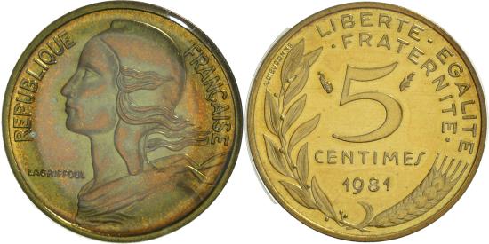 | | Coin, France, Marianne, 5 Centimes, 1981, Paris, FDC, | | | Marianne, Liberty bust left, Denomination above date, grain sprig below, laurel branch at left, 1991-1993 dated coins, non-Proof exist in both coin and medal alignment., Henri Lagriffoul | | FEATURES |
