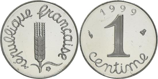 | | Coin, France, Épi, Centime, 1999, Paris, Proof / BE, , Stainless | | | Épi, Cursive legend surrounds grain sprig, Cursive denomination, date at top, 1991-1993 dated coins, non-Proof, exist in both coin and medal alignment. Values given here are for medal alignment examples. Pieces struck in coin alignment have been traded for as much as $50.00. | | FEATURES |