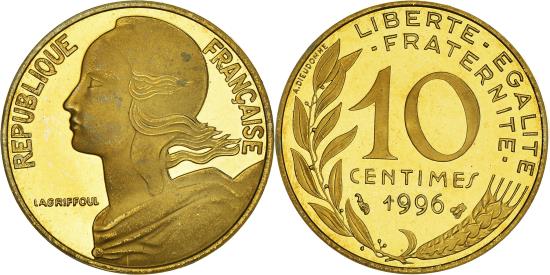 | | Coin, France, Marianne, 10 Centimes, 1996, Paris, Proof, | | | Marianne, Liberty bust left, Denomination above date, grain sprig below, laurel branch at left, Without mint mark. 1991-1993 dated coins, non-Proof, exist in both coin and medal alignment., Henri Lagriffoul | | FEATURES |