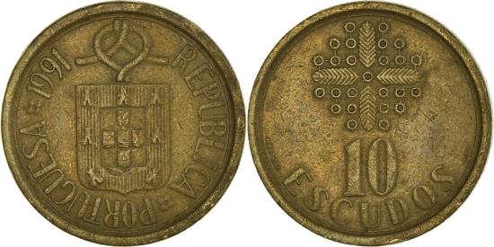 | | Coin, Portugal, 10 Escudos, 1991, , Nickel-brass, KM:633 | | | Design above shield, Artistic design above value | | FEATURES |
