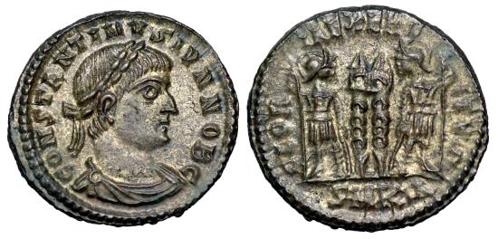 CONSTANTINVS IVN NOB C; laureate, draped and cuirassed bust right.