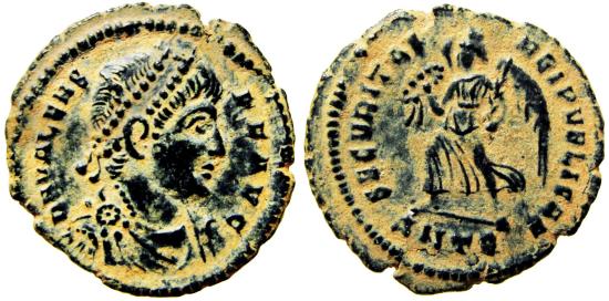Valens AD 364-378. Antioch Follis Æ 16mm., 2,18g. D N VALENS P F AVG, pearl-diademed, draped, and cuirassed bust right / SECVRITAS REIPVBLICAE, Victory walking left, holding wreath and palm branch, ANT E in exergue. very fine RIC IX Antioch 12b. |
