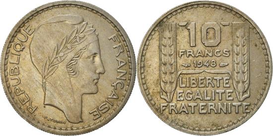 | | Coin, France, Turin, 10 Francs, 1948, Paris, , Copper-nickel, KM:909.1 | | | Turin, Laureate head right, small head, Denomination above date, inscription below, grain columns flank, Without mint mark. | | FEATURES |