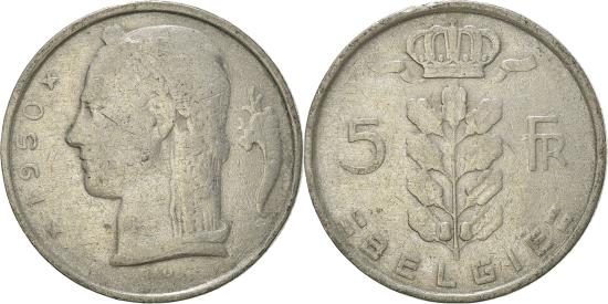 | | Coin, Belgium, 5 Francs, 5 Frank, 1950, , Copper-nickel, KM:135.1 | | | Plant divides denomination, Crown at top, legend in Dutch, Laureate head, left, small diamonds flank date at left, symbol at right, BELGIE Rau | | FEATURES |