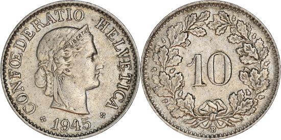 | | Coin, Switzerland, 10 Rappen, 1945, Bern, , Copper-nickel, KM:27 | | | Crowned head right, Value within wreath, CONFOEDERATIO HELVETICA Karl Schwenzer | | FEATURES |