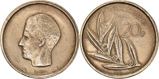 | | Coin, Belgium, Baudouin I, 20 Francs, 20 Frank, 1981, , Nickel-Bronze | | | Head, left, Denomination at right above stylized spray, legend in French | | FEATURES |