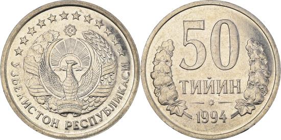 | | Coin, Uzbekistan, 50 Tiyin, 1994, , Nickel Clad Steel, KM:6.1 | | | Arms within wreath below stars, Small denomination and date flanked by sprigs, 2 varieties of sunray arrangements exist; all coins show orthographic error in 1st letter of ellik within edge inscription. | | FEATURES |