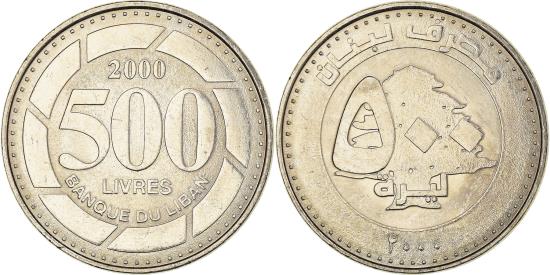 | | Coin, Lebanon, 500 Livres, 2000, , Nickel plated steel, KM:39 | | | Arabic legend above large value on cedar tree, Large value 500, thick segmented circular border | | FEATURES |