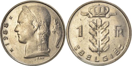 | | Coin, Belgium, Franc, 1988, , Copper-nickel, KM:143.1 | | | Plant divides denomination, crown at top, legend in Dutch, Laureate bust, left, date at left, small symbol at right, BELGIE | | FEATURES |